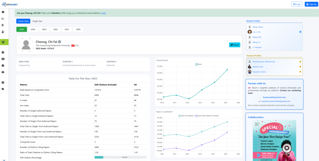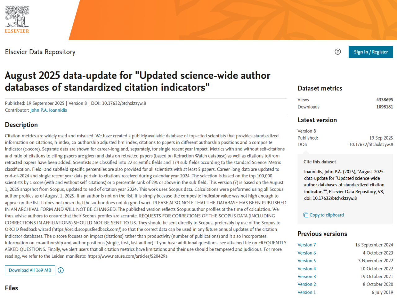 全球首2%科学家榜单涵盖超过100,000名全球各地顶尖科学家,将其归纳入22个学科及174个领域,并以学者截至2024年底的论文引用次数、个人科研成果,以及论文影响力综合指标等编制排行榜。榜单提供了面向科学家长期科研表现的衡量指标,客观真实反映科学家的学术影响力。