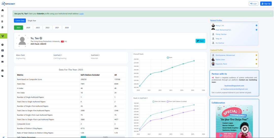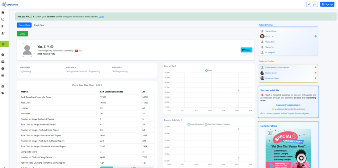 港理大温州技术创新研究院新材料技术与海洋工程装备研究中心副主任尹振宇教授同时入选地质与测绘工程领域全球首2%科学家「学术生涯引文影响力排行榜」和「年度引文影响力排行榜」两个榜单。