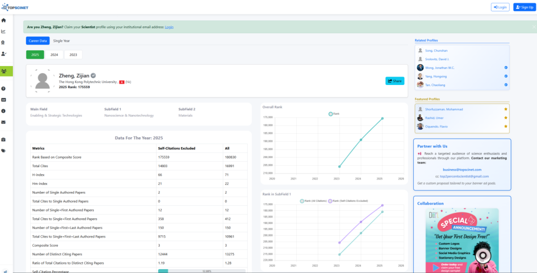 港理大温州技术创新研究院柔性电子研究中心主任郑子剑教授同时入选纳米科学与纳米技术领域全球首2%科学家「学术生涯引文影响力排行榜」和「年度引文影响力排行榜」两个榜单。