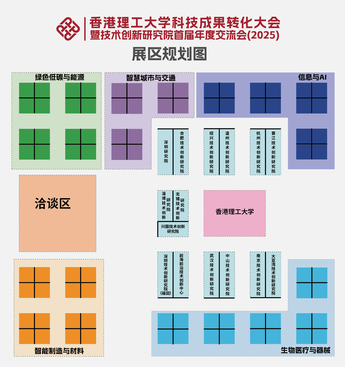 现场特设智能制造与材料、生物医药与医疗器械、信息与AI、智慧城市与交通、绿色低碳与能源五大主题展区,集中呈现香港理工大学、内地15所研究院及研究中心、未来挑战赛及校友力量的卓越成果。